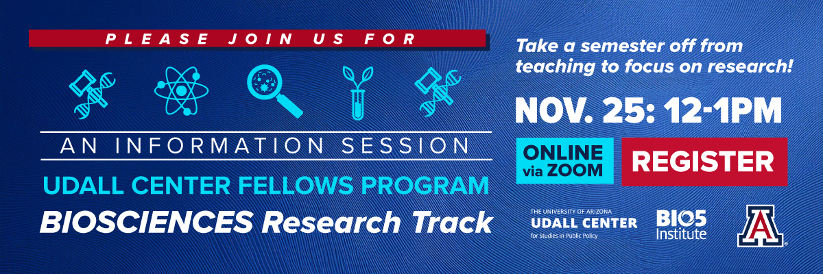 The Udall Center and the BIO5 Institute invite you to an online information session about the Biosciences and Public Policy Track of the Udall Center Fellowship on Tuesday, November 25 at 12 p.m. This program invites U of A faculty to take a semester away from teaching or service-related responsibilities to focus on research. We’re seeking pairs of U of A investigators from different disciplines with an interest in incorporating a policy dimension or applying their policy expertise to a health-related scientific project for this unique opportunity. Meeting will be recorded for those who cannot attend live. Register at https://tinyurl.com/BioTrackInfo